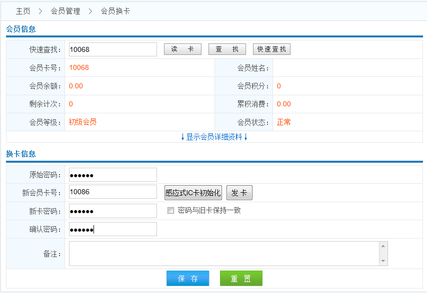 1.當會員卡消磁,損壞,或者遺失的時候,商家可以為會員進行換卡操作,在換卡操作后,系統(tǒng)自動將該會員原始數(shù)據(jù)同步到新的會員卡信息內.