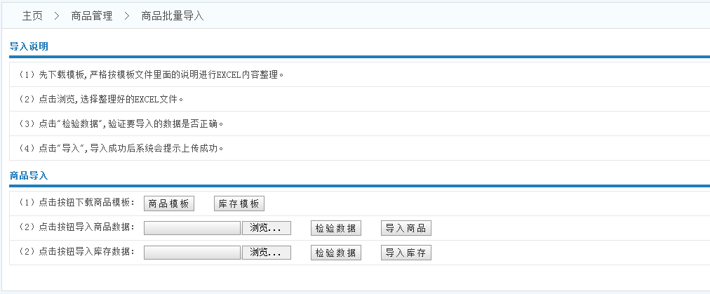 商品模板------>錄入數(shù)據(jù)------>點(diǎn)擊瀏覽------>檢驗(yàn)數(shù)據(jù)------>導(dǎo)入商品------>導(dǎo)入成功