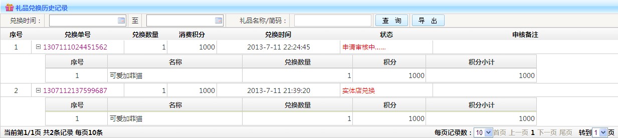 消費(fèi)記錄: 1.查詢(xún):可以根據(jù)兌換單號(hào) 時(shí)間段 等條件查詢(xún) 2.導(dǎo)出:可以將按條件查詢(xún)出來(lái)的數(shù)據(jù),以Excel表格形式導(dǎo)出 3.列表:雙擊兌換單號(hào),可以查看消費(fèi)詳情 (見(jiàn)下圖)