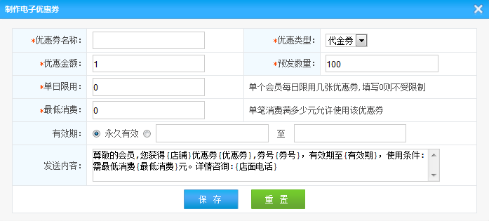 單日使用:單個會員每日限用幾張優(yōu)惠券,填寫0則不受限制