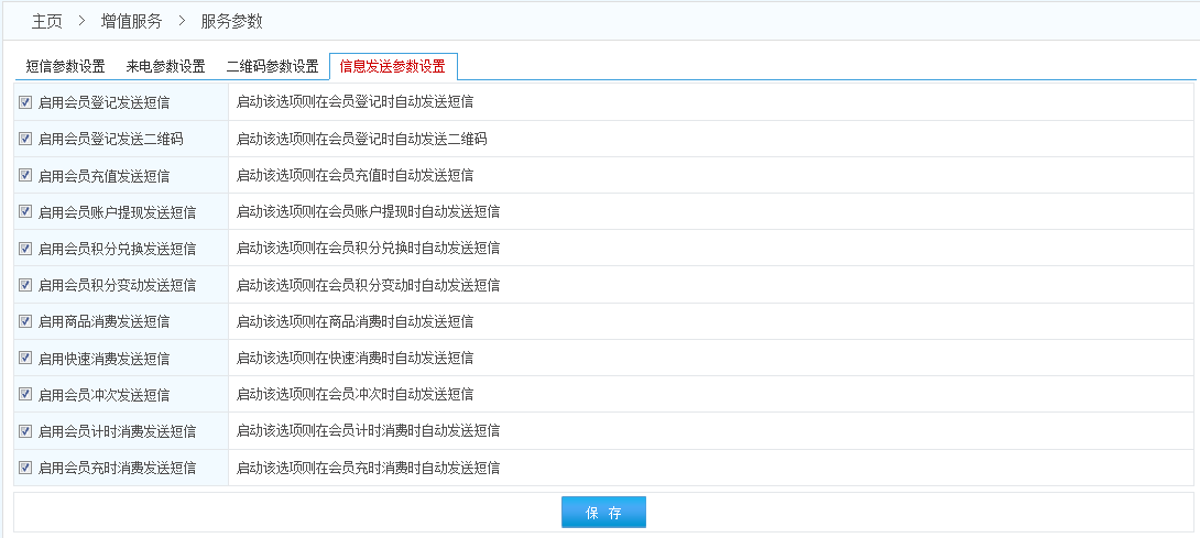 注意: 1.每一個參數(shù)對應著系統(tǒng)的一個功能,請務必閱讀完每條參數(shù)后面的說明文字后 再開啟或關(guān)閉該功能。 2.通知短信是會員在本系統(tǒng)中進行消費充值等操作時給會員發(fā)的提醒短信;營銷短信是為了促銷等目的專門為一個或多個會員發(fā)送的(營銷短信有且只能在發(fā)送短信的頁面發(fā)送)